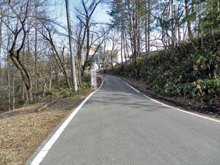 前方の標識には、 左方向に「活動地 朝日少年自然の家」。 右(直進)方向に「楯山公園」とある。 |
