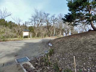 「楯山公園(日本一公園)」への入口と駐車場。 「楯山(たてやま)公園」は、将棋の駒で知られるJR奥羽本線「天童駅」から