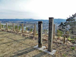 2018/4/10(15:54) 最上川ビューポイントに立つ「標柱」。 右の標柱には、「やまがた地域の絵になる風景」。 左の標柱には、「最上川ビューポイント選定地点」
