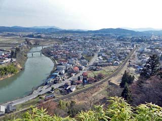 「最上川ビューポイント」から見る景色。 写真中央が概ね南の方向で、眼下に「最上川」。その右方に「佐沢」の街並み。