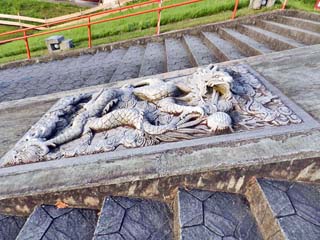 「高麗館(物産館)」前の石段に刻まれる「龍」。