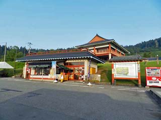 道の駅「とざわ」の駅舎と「高麗館(物産館)」。