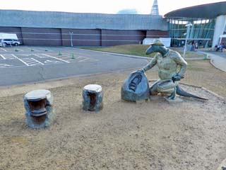2015/10/27(14:48) 福井県立「恐竜博物館」前に展示される作品。 「ラプトル先生」が、左手にハンマーを持ち、 化石の発掘作業を行っている。 |