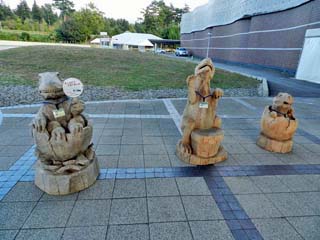 2015/10/27(14:50) 福井県立「恐竜博物館」前に展示される作品。 館の出入口前には、木彫りの恐竜が並ぶ。 |