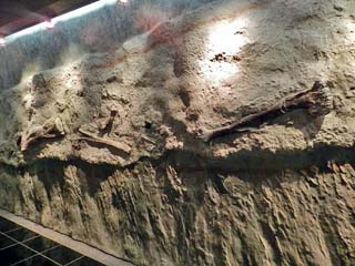 2015/10/27(14:55,14:56) 「ダイノストリート」。 地下1階は、「ダイノストリート」と呼ばれ、化石標本の実物などが展示されている。 右の写真、通路の壁は、恐竜や動植物の化石が集中する地層(ボーン・ヘッド)を模している。 |