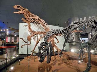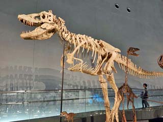 2015/10/27(15:03,15:04,15:04) 「恐竜の世界」-「恐竜の繁栄-竜盤目」の展示物。 「恐竜の世界」ゾーンには、40体を超える数の「恐竜全身骨格」が展示されている。 勿論そのほとんどは「レプリカ」なのだが、中には実物の骨を用いて組み上げられたものもあるので、 興味のある方は、注意深く観察することをお勧めする。 なお、恐竜は大きく「竜盤目」と「鳥盤目」に別れ、基本的に骨盤の恥骨の向きによって区別される。 一般に「竜盤類」は、骨盤が前向きで「トカゲ型」の形をしており、 一方、「鳥盤類」は、骨盤が後ろに向く「鳥型」の形をしている。 また、「竜盤目」は、「獣脚類(獣脚亜目)」と「竜脚類(竜脚形亜目)」の2つに細分される。 右の写真をクリックすると拡大写真(600x450)が表示されます。 |
