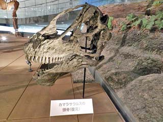 2015/10/27(15:11,15:12) 「カマラサウルスの頭骨」の実物(左)と復元(右)。 アメリカで発見された「カマラサウルス」の化石は、ほぼ全ての骨が揃っており、福井県立恐竜博物館では、 平成21年(2009)年に、これを購入。クリーニングや補修の後、実物の骨を用いて組み上げた、全長15m、 高さ5mの「全身骨格」も、同じフロアに展示されている。 左の写真をクリックすると拡大写真(600x450)が表示されます。 |