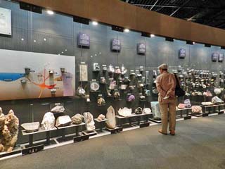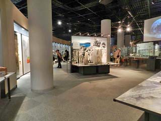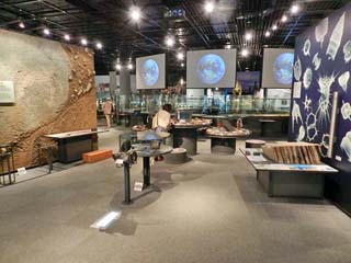 2015/10/27(15:26,15:27,15:28) 「地球の科学」ゾーンの中央部。 「地球の科学」ゾーンの中央には、「水と地球」と「火と地球」をテーマに、陸や海の「堆積物」、堆積物に埋積された「化石」、 マグマからできた「岩石」、地球からの贈り物「鉱物」や「宝石」などが展示されている。 |