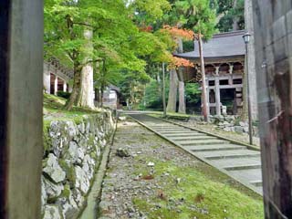 2015/10/27(13:24) 伽藍東側の廻廊を下りる。 西側の廻廊を登るときは、それほど気付かなかったが、 下りでは、履いている靴下が、非常に滑りやすい。 |