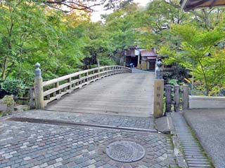 2015/10/27(7:28) 「こおろぎ橋」。 総ヒノキ造りの橋で、案内板には「元禄時代以前から 架かる」とあるが、現在の橋は、平成2年(1990)に 架け替えられたものである。 写真をクリックすると「こおろぎ橋」の上から撮る 「大聖寺川」の写真(433x650)が表示されます。 |