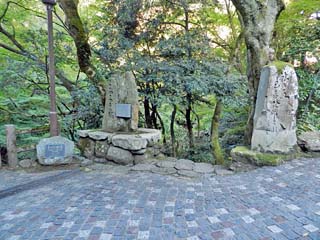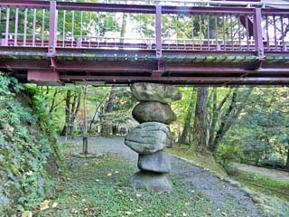 2015/10/27(7:27) 「岩不動」。 「目の神様」だという。 向かいには、休憩用の小広場があり、「公衆トイレ」、 「休憩用ベンチ」と、九谷の陶石で作られた 「こおろぎ橋」の案内板が立つ。 写真をクリックすると「こおろぎ橋」の 案内板(800x600)が表示されます。 |