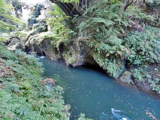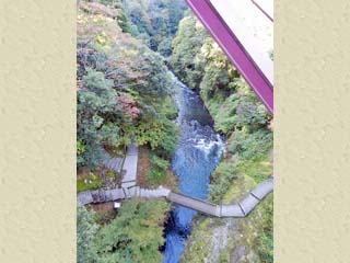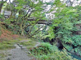 2015/10/27(7:25) 「鶴仙渓遊歩道」に入り、少し歩いた所で撮影。 奥の建物は、みやこわすれの宿「こおろぎ楼」。 遊歩道の右には、「岩不動」が見えている。 |