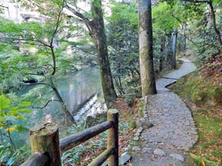 2015/10/27(7:12,7:23) 道の駅「山中温泉 ゆけむり健康村」と「鶴仙渓遊歩道入口」。 加賀の名湯「山中温泉」にある「鶴仙渓」は、温泉街の東を流れる「大聖寺川」の渓谷である。 この渓谷沿い約1.3kmが自然遊歩道として整備されており、30分程の時間で歩くことができる。 本ページでは、道の駅「ゆけむり健康村」をスタート。「こおろぎ橋」、「あやとりはし」を通り、 「黒谷橋」まで歩いた記録を紹介する。 また、次のページ「山中温泉散策(まちなか散策)」では、「黒谷橋」から「山中座」、「医王寺」に 立ち寄り、「南町ゆげ街道」を歩き、道の駅「ゆけむり健康村」へと戻った記録を紹介する。 右の写真、中央の道が「鶴仙渓遊歩道」であるが、この写真は「道の駅」の方向を向いて撮影している。 つまり、「道の駅」をスタートすると、ここで右にUターンするように「遊歩道」へと入る。 また、写真の撮影時刻では、道の駅から遊歩道入口までに、10分以上経過しているが、 実際の距離は600m程である。 右の写真をクリックすると「鶴仙渓遊歩道お散歩マップ」が表示されます。 この「お散歩マップ」は、1,200x650ピクセルあります。 「お散歩マップ」の文字を読みたいときには、表示された画像をクリックし、スクロールバーをご利用下さい。 |