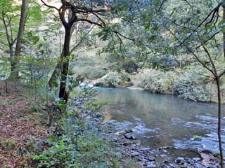 2015/10/27(7:50) ほぼ中央に「采石巌」?。 「采石巌」前の休憩所から20~30m下流に歩いた ところから、上流の方向を撮る写真である。 案内板にも、「目前の岩、さしたるものではないが」と あるように、これが「采石巌」なのであろう。 写真をクリックすると3.75倍ズームで撮る「采石巌」の 写真(600x450)が表示されます。 |