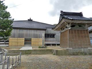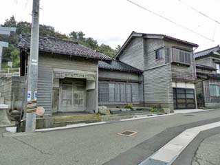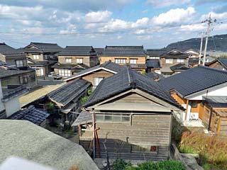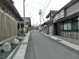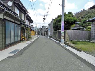 2012/11/3(9:48) 「天領北前船資料館」から北に向けて歩く。 この道は、国道249号線から100m程東を 平行する道で、「黒島地区」のほぼ中央を 縦断している。 「天領北前船資料館」は、この「黒島地区」の ほぼ中央にある。 なお、「天領北前船資料館」は、8月13日から 休館中との張り紙があったが、1年以上前の 平成23年(2011)8月から休館中のようである。