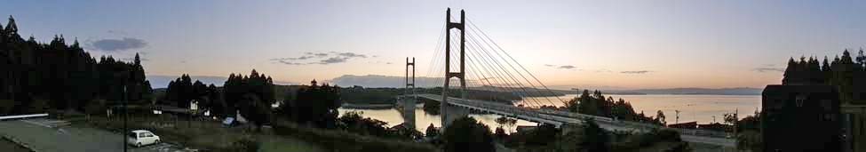 2012/11/4(6:11) 「ツインブリッジのと」。 平成11年(1999)開通。全長1,050m、海上部分の長さ620m。 車道の幅員は6.5mであるが、「七尾西湾」側には幅1.5mの歩道が あり、橋を歩いて渡ることもできる。 写真をよく見ると、橋の下には「猿島」が写っている。 |
