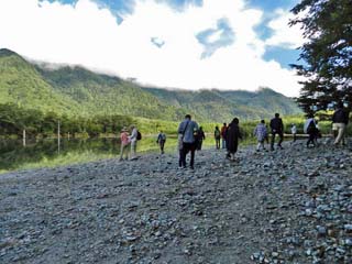 2019/9/25(9:05) 「大正池」。 中部山岳国立公園の標高約1,500mにあり、誰でもが知る山岳景勝地「上高地」。 冬の最低気温は、氷点下30度を下回るが、夏は、昼間でも20度前後と過ごしやすく、 「河童橋」を中心とする長さ約10km、幅約1kmの平坦地(堆積平野)は、 夏の避暑地として一般客に人気。また、「穂高連峰」や「槍ヶ岳」への登山基地として、 登山者には憧れの場所であり、国の文化財(特別名勝・特別天然記念物)にも指定される。 自然環境の保全などから、年間を通してマイカーの乗入れが規制されており、 「上高地」への入口「釜トンネル」から先に、マイカーで入ることはできない。 この日は、「沢渡(さわんど)」に車を駐め、「大正池」までシャトルバスを利用。 本ページでは、「大正池」から「田代橋」までを「梓川」の左岸。 「田代橋」から先、「河童橋」までを「梓川」の右岸に沿って歩いた記録を紹介する。 また、次の河童橋~明神池のページでは、「河童橋」から「明神」までを「梓川」の右岸。 帰路は、「明神」から「河童橋」まで「梓川」の左岸を歩いた記録を紹介する。 紹介するコースは、比較的平坦地で、高低差は少なく、合計の距離で、約10.1km、 平均歩行時間約3時間10分である。 上のパノラマ写真は、中央左に「焼岳」。右端の「穂高連峰」は雲に隠れる。 写真をクリックすると「上高地案内図」が表示されます。 この案内図は、1,800x900ピクセルあります。 案内図の文字を読みたいときには、表示された画像をクリックし、スクロールバーをご利用下さい。 なお、本ページで記述する距離と時間は、「小梨平」で見た「上高地散策マップ」から算出しており、 この「上高地散策マップ」は、本ページに続く「上高地散策(河童橋~明神池)」のページで紹介しています。 |