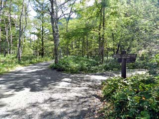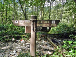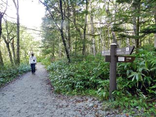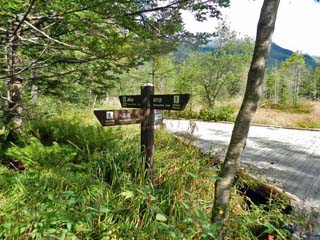 2019/9/25(9:07) 「田代池」に向かう。 途中、「梓川コース」と「林間コース」の分岐点に 立つ案内板には「大正池や田代池を巡りながら、 上高地の自然を学ぶ」、この遊歩道のことを、 「自然研究路」と書かれていた。 |