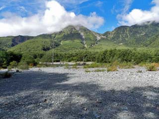 2019/9/25(9:14) 「穂高連峰」は、写真中央奥にあるが、 雲の下に隠れる。 「自然研究路」の川原側には、ロープが張られ、 川原への立入は、禁止されていた。 |