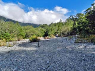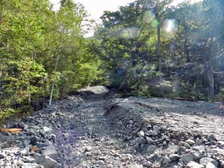 2019/9/25(9:15) 「砂礫の堆積」。 「自然研究路」の山側(中千丈沢)には、 「霞沢岳」から押し出された「砂礫」が見られ、 近くには「砂礫の堆積」の案内板が立つ。 写真をクリックすると「砂礫の堆積」の 案内板(800x400)が表示されます。 |