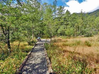 2019/9/25(9:32) 「簡易木道」。 「梓川」の増水により、泥濘ることの多い場所には、 幅の狭い簡易な木道も造られている。 |