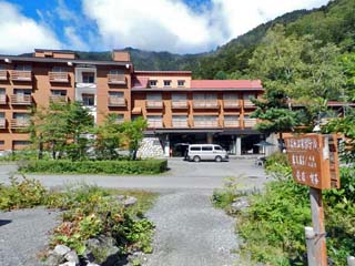 2019/9/25(10:03) 「上高地温泉ホテル」。 右隣りには、「上高地ルミエスタホテル (旧上高地清水屋ホテル)」が建つ。 両ホテルとも「源泉掛け流し」の天然温泉で、 日帰り入浴も可能だという。 |