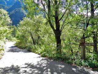 2019/9/25(10:13) 標識には、直進方向に「河童橋 直進0.8km」、 右の方向に「梓川コース」とあるが、 距離の記述なし。 距離が分からないのは不安なので、直進する。 |