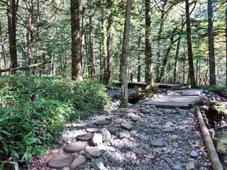 2022/9/30(10:49) 前方に「明神橋」。 ここで「梓川」を離れ、「嘉門次小屋」に向かう。 写真をクリックすると中央付近を切抜く 画像(600x450)が表示されます。 |