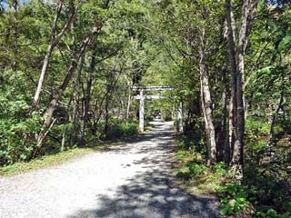 2022/9/30(10:50) 「穂高神社奥宮」の鳥居。 鳥居の先に、「嘉門次小屋」と「穂高神社奥宮」。 「穂高神社奥宮」の中(神域)に「明神池」がある。 |