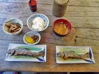 2022/9/30(11:03) 「嘉門次小屋」で食事。 写真は、「塩焼定食(岩魚1尾)」に 「岩魚の塩焼(1尾)」を単品で追加。 |