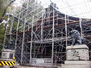 2010/10/28(10:43) 「神楽殿(重要文化財)」。 三方切妻造りで天保六年(1835)立川和四郎二代目 富昌の作。 正面の「大注連縄(しめなわ)」は、 「御柱大祭」毎に新しく奉製され重量は約1トン というもので、是非見てみたかったが、平成の 大修理中で、見ることはできなかった。 左右に写る「狛犬」は、身長1.70m、青銅製 では日本一と言われる。 |