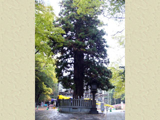 2010/10/28(11:05) 「根入りの杉」。 樹齢600~700年、高さ約35mの 杉の大木。 「丑三つ時になると枝先を下げて寝入り、 いびきが聞こえ、子供に木の小枝を煎じて 飲ませると夜泣きが止まるといわれている」と ある。 |