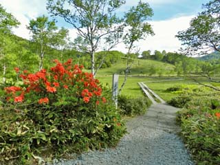 2012/6/25(15:33) 国道292号線「志賀草津道路」を走行して いると、木道が見えたので寄って見る。 案内板には、書かれていないが国道から見えた のは、「田ノ原湿原」。近くには「三角池」も ある。 写真をクリックすると案内板が拡大表示 (800x600)されます。