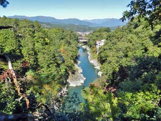 2015/10/25(10:24) 「上の展望台」から見る「天竜峡」。 「天竜川」上流方向の景色である。 70mの高さから見る「天竜峡」は絶景なのだが 手前の木の葉が、ちょっと気になる。 写真をクリックすると縦に撮る写真(450x600)が 表示されます。 |