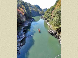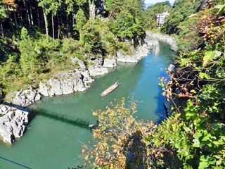2015/10/25(10:38) 「つつじ橋」の上から見る「天竜川」上流方向。 「天竜ライン下り」の舟には、船頭が前後に各1名。 乗客は、全員が「救命胴衣」を着用している。 この「天竜ライン下り」は、「天竜峡駅」近くの乗船場から JR飯田線で下流方向に3駅離れた「唐笠駅」近くの 着船場までを、舟で約40~50分かけて下り、帰りは、 「唐笠駅」からJR「飯田線」か、無料のシャトルバスで、 「天竜峡駅」まで戻るのだという。 写真をクリックすると3.5倍ズームで撮る 「ライン下りの舟」が表示(600x450)されます。 |