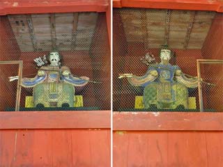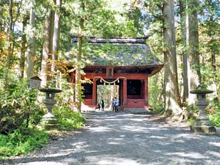 2014/9/29(11:44,11:45) 「随神門」と「随神像」。 案内図では、「大鳥居」から「随神門」までの距離は1kmで、徒歩約15分。 「随神門」から「奥社」までも、距離は同じ1kmだが、後半登坂となるため、徒歩約25分となる。 どちらの写真もクリックすると拡大写真(600x450)が表示されます。 |