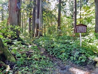 2014/9/29(11:50) 「奥社院坊跡」。 明治維新の「神仏分離」前に、「戸隠権現」に奉仕した 院坊の跡とある。 写真をクリックすると「奥社院坊跡」の 案内板(600x450)が表示されます。 |