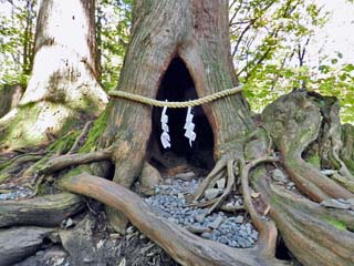 2014/9/29(11:54) 「うろ(樹洞)」。 平成22年(2010)に、TV放送されたJR東日本「大人の 休日倶楽部」のCMで、「吉永小百合」がこの穴の中に 入ったことで一躍有名になった「老杉のうろ」である。 |
