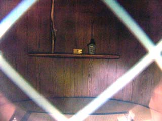 2010/6/6(8:17) 「酒樽茶室」の内部。 下は、「畳」か「ゴザ」のようである。 正面の棚には、なぜか「徳利」と「枡」が乗って いる。 |