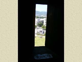 2010/6/6(8:36) 「上田城櫓」の中に入ってみた。有料だが小銭で 入れる上に、共通券になっていて、「市立博物 館」と「山本鼎記念館」にも入ることができる。 写真は、「上田城南櫓」の「矢狭間(敵の来襲に 矢で防戦するための小窓)」。 |