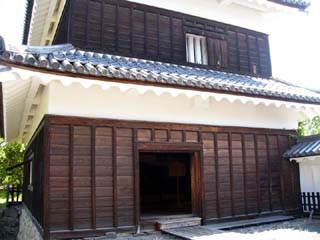 2010/6/6(8:21) 近くで見る「上田城西櫓」。 建物の外壁は煤と柿渋で防水した板が使われて いるとのこと。 |