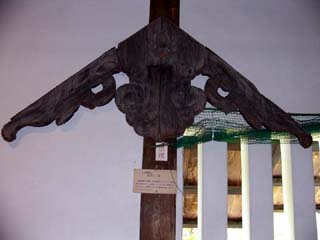 2010/6/6(8:48) 「上田城隅櫓の懸魚と鰭」。 「西櫓」の西側破風についていた飾りで、安政 6年(1859)の製作。昭和57年、「西櫓」修理の 際に、新しいものと取りかえられたとある。 |