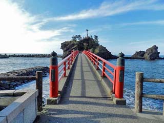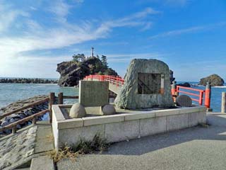 2012/11/4(14:30,14:30) 「弁天岩」と「曙橋」。 「弁天岩」は、JR北陸本線「能生駅」の北北東約1.5kmにあり、約300万年前の 海底火山の噴火により噴出した火砕流堆積物でできたという、周囲250m程の岩である。 毎年夏には、「ふるさとのう海上花火大会」が開催され、弁天岩を背景とした水中爆雷や爆雷、 曙橋にかかるナイヤガラの滝を見る観光客で賑わうという。 左の写真をクリックすると拡大写真(600x450)が表示されます。