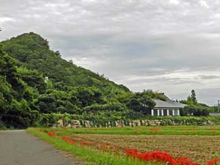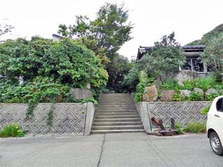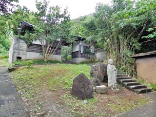 左の写真、左方山の中腹に「大地蔵」の頭部が飛び出ている。右方の建物は、音楽と陶芸の宿「花の木」。 右の写真、石段を上がった左手に、音楽と陶芸の宿「花の木」がある。 左の写真をクリックすると拡大写真(600x450)が表示されます。 |