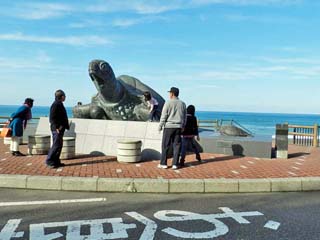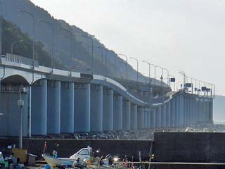 2012/11/4(13:17) 「親不知ピアパーク」から見る日本海。 「親不知ピアパーク」は、海上にせり出した北陸自動車道の高架橋下の空間と橋脚を利用した「道の駅」である。 「親不知・子不知」は、飛騨山脈の北端が断崖絶壁となって日本海に没する地にあり、古来から「北陸道」最大の難所であった。 源平の世、越後に移った夫(平清盛の弟、平頼盛)を慕い会いに行く妻が、この地を通りかかった際に、赤ん坊を波にさらわれ、 その悲しみを詠んだという「親知らず 子はこの浦の波枕 越路の磯の 泡と消えゆく」が、「親不知」の地名の由来という。 目の前にある「親不知海岸」では海水浴、スキューバダイビング、磯釣りなどのマリンレジャーが楽しめる。
