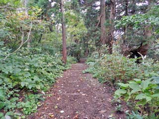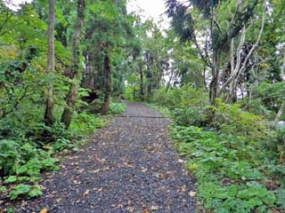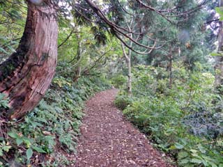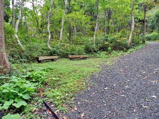 直前まで砂利道を歩いていた足には、フワフワした 感じが心地よい。また遊歩道には、一部に短い坂が あるものの、標高差も少なく、歩き易い。 |
