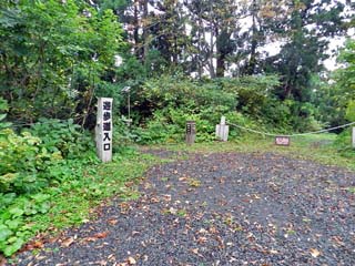 「ドンデン縦走路入口」。 遊歩道を一周すると、この場所に出る。 遊歩道の入口は、案内版の先にある。 |