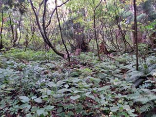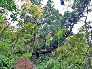 遊歩道から横に目を向けると、まさに手つかずの 原生林という雰囲気である。 厳しい環境で生育が遅いのか、幹の細い木が多い。 写真をクリックすると拡大写真(600x450)が 表示されます。 |