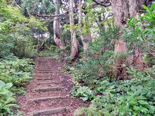 「ドンデン縦走路」を下る。 途中右側に、「大野亀」や「粟島」が望める展望台があるのだが、この日は雨で展望は望めないこともあり、