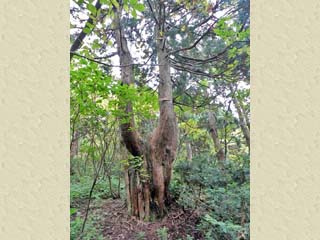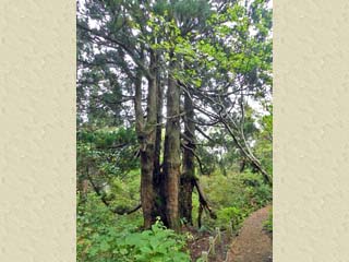「大黒杉」と「家族杉」の間に立つ無名の「杉」。 名前の付けられていない杉だが、「双子杉」、「音叉杉」、 等々、いくらでも名前の付けられそうな杉である。 写真をクリックすると拡大写真(450x600)が 表示されます。 |